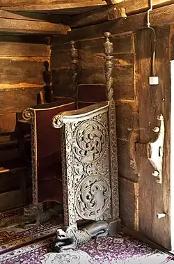 În registrul de sus, de asemenea, se află o suită de panouri semicirculare în partea superioară, în centrul cărora sunt fixate plăci decorative și discuri în rozetă, iar ca niște paftale domnești, la întretăierea arcurilor, se află alte discuri mai mici, deopotrivă de fin realizate. Pe ele sunt așezați porumbei, care parcă stau gata de zbor. Fiecare poartă în cioc un clopoțel, care sunau la adierea vântului.
