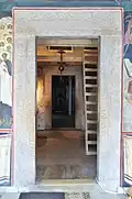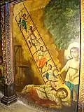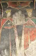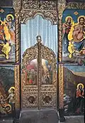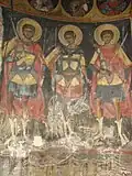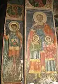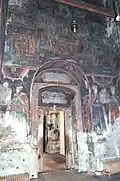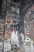 La Tismana, picturi murale cu o valoare artistică deosebită, executate de Dobromir cel Tânăr din Târgoviște, în 1564, împodobesc pronaosul; din 1732, executate de echipa Ranite Grigorie, în naos, repictată în frescă de Dumitru Diaconu, în 1766; aici s-a nevoit și înduhovnicit Cuviosul Nicodim de la Tismana (1406), de neam valah.[3] Actuala biserică este o construcție mult schimbată din anul 1855, clădită în stil romanic, cu elemente de decorație neogotică.[4]
