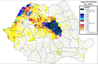 Ponderile cele mai mari de populație maghiară se înregistrează în județele Harghita (84,61%) și Covasna (73,81%). În cifre absolute, orașul din România cu cel mai mare număr de etnici maghiari este municipiul Târgu Mureș, cu peste 57.000 de maghiari (2011). În procente, orașul cu cea mai mare pondere de maghiari este municipiul Odorheiu Secuiesc, cu o pondere a comunității maghiare de 92,43% dintr-un total de 34.257 de locuitori (2011).