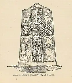 Tradiția, din vremea lui Fordun sau chiar mai veche, este că piatra pictă astăzi denumită „Glamis 2” este „piatra funerară a regelui Malcolm”. Ea este o piatră de clasă II, formată probabil prin reutilizarea unui monolit din epoca bronzului. Datarea ei nu este certă, fiind propuse numeroase date, începând cu secolul al VIII-lea. Asocierea cu Máel Coluim a fost propusă pe baza iconografiei gravurilor.[30]