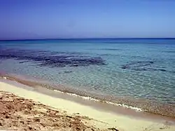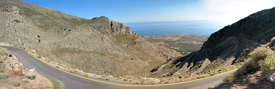 Vedere a câmpiei Frangokastello și a Mării Libiei din insula Creta. Insula Gavdos este abia văzută la orizont, în partea dreaptă.