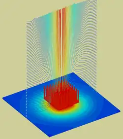 Soluția este o suprafață determinată de liniile (curbele) caracteristice. Ecuațiile eliptice se caracterizează prin faptul că nu există linii caracteristice (ele sunt imaginare), perturbațiile se propagă în toate direcțiile, domeniul soluțiilor este unul închis și este necesară precizarea condițiilor la limită la frontierele domeniului modelat (pt. condiții la limită, v. mai jos).[15] Ecuațiile eliptice sunt adecvate de exemplu pentru modelarea curgerii, a conducției termice staționare, a difuziei, a stratului limită, a reacțiilor chimice.[16]
