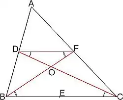 În figura alăturată se observă că este linia mijlocie a triunghiului :, opusă laturii . Prin urmare, este paralelă cu și are lungimea egală cu .