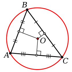 Construcția cercului circumscris unui triunghi (cu roșu) și a centrului cercului circumscris (punctul roșu)