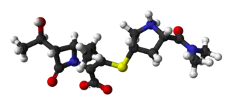Meropenem (cu denumirea comercială Meronem) este un antibiotic din clasa carbapenemelor, fiind utilizat în tratamentul unor infecții bacteriene.[9] Printre acestea se numără: pneumonie (inclusiv cea comunitară și nosocomială), infecții complicate de tract urinar și intra-abdominale, infecții complicate cutanate și ale țesuturilor moi, meningită, septicemie și antrax.[9][10] Calea de administrare disponibilă este intravenoasă.[9]