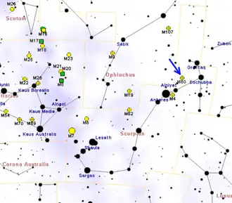 M80 este un roi globular cu magnitudinea 8. Vizual, se aseamănă cu o cometă. Diametrul său unghiular este de 9 minute de arc.
