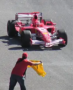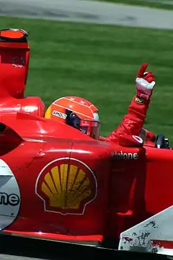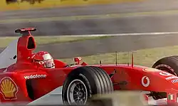 Schumacher la volanul monopostului F2002 în Marele Premiu al Franței din 2002, cursa la care a câștigat titlul din 2002, stabilind recordul pentru cele mai puține curse pentru obținerea titlului.