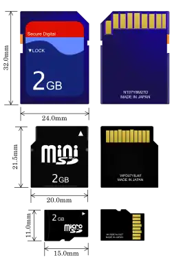 miniSD ![]() | 21,5 x 20 x 1,4 | 2,7 – 3,6 V | 11 | 2 GB | |