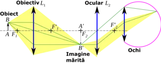 Obiectul cercetat având o dimensiune liniară se așează în apropierea focarului al obiectivului pentru a se forma o imagine reală, mărită și răsturnată. Imaginea este „obiect” real pentru ocularul microscopului așezat astfel încât să se poziționeze între focarul obiect al ocularului și ocular, în scopul obținerii unei imagini virtuale și mărite, acesta constituind totodată și imaginea finală dată de microscop.