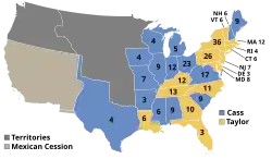 În cele din urmă, candidatura Taylor/Fillmore a câștigat clar, iar voturile electorale din New York au fost din nou esențiale pentru alegeri.[83] Candidatura Whig a câștigat votul popular cu 1.361.393 (47,3%) la 1.223.460 (42,5%) și a triumfat în Colegiul Electoral cu scorul 163-127.[b] Candidații partidelor mici nu au primit nici un vot electoral[84], dar puterea mișcării anti-sclavie a fost demonstrată de votul pentru Van Buren, care, deși nu a câștigat nici un stat, a obținut 291.501 voturi (10,1%) și a terminat pe locul doi în New York, Vermont și Massachusetts.[85]