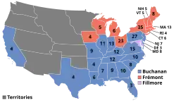 În ziua alegerilor, Buchanan a câștigat cu 1.836.072 voturi (45,3%) și 174 de voturi electorale față de 1.342.345 voturi (33,1%) ale lui Frémont și 114 voturi electorale. Fillmore și Donelson au terminat pe locul al treilea, câștigând 873.053 de voturi (21.6%) și câștigând statul Maryland și cele 8 voturi electorale.[g] Candidatura Partidului American a pierdut mult în mai multe state sudice și au lipsit doar puțin sub 8.000 de voturi în Louisiana, Kentucky și Tennessee pentru ca alegerea președintelui să fie decisă în Camera Reprezentanților, unde spectrul secesiunii ar fi făcut rezultatul nesigur.[138]