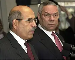 Conflictul dintre Mohamed El Baradei și administrația americană se intensifică în 2002, când Statele Unite acuză regimul irakian de deținere a armelor de distrugere în masă și cer inspectorilor ONU să aducă probe în susținerea acestei ipoteze. Verificarea urma să fie condusă de El Baradei și Hans Blix. În urma verificării nu au fost obținute rezultatele așteptate de americani. Cu două săptămâni înainte de invazia Irakului (martie 2003) El Baradei va declara că inspectorii internaționali nu au depistat dovezile necesare pentru acuzarea Irakului de creare a unei arme nucleare. SUA vor acuza ONU de incompetență și vor trimite trupe militare în Irak. Directorul general AIEA afirma că deși nu a existat nici o dovadă a deținerii armelor de distrugere în masă de către statul irakian, presupusa prezență a acestora a servit drept argument în favoarea războiului. Cel mai mult a avut de suferit Hans Blix, șeful Comisiei ONU pentru Monitorizare și Verificare[4], care va părăsi organizația. Evenimentele ulterioare vor scoate în evidență faptul că AIEA și El Baradei au avut dreptate. După mai mulți ani de ocupație în Irak nu au fost găsite armele de distrugere în masă căutate.