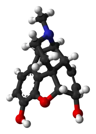 Morfina este un agonist opioid, fiind utilizat ca analgezic puternic.[7][8] Termenul provine de la numele lui Morpheu, zeul visurilor în mitologia greacă.[9][10] Este principalul agent activ din opiu (sub formă de meconat), concentrația sa în extractul de opiu variind între 8 și 14%, cu o medie de 10%. Este un analgezic foarte puternic, face parte din grupa alcaloizilor morfinanici propriu-ziși alături de codeină și tebaină. Căile de administrare disponibile sunt multiple; se poate administra subcutanat, intravenos, intramuscular, intratecal, rectal și oral.[7]