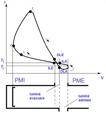 Pistonul își continuă deplasarea și deschide ferestrele de admisie, DLA. Deoarece presiunea în cilindru a devenit mai mică decât cea din colectorul de admisie, fluidul intră în cilindru. Acesta, dirijat corespunzător, face ca gazele arse din cilindru să ajungă în colectorul de evacuare pentru a se asigura umplerea cilindrului. Procesul de încărcare continuă până la închiderea completă a luminilor de admisie ILA și de evacuare ILE. În continuare începe comprimarea efectivă a încărcăturii urmată de aprindere (s) și ardere. Urmează repetarea întregului proces.