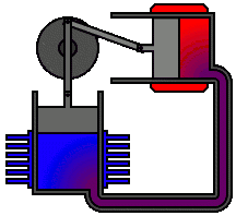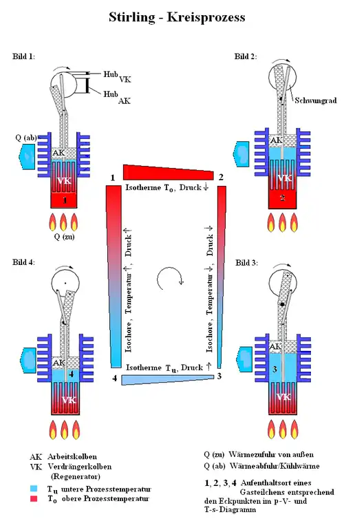- Timpul 4->1: Volantul se învârte în continuare și prin aceasta pistonul de refulare se va deplasa în sus. Acest lucru are ca rezultat trecerea gazului din zona superioară rece în zona inferioară caldă (încălzire). Regeneratorul cedează gazului de lucru căldura înmagazinată în timpul 2 preîncălzindu-l. Ciclul se reia de la început.