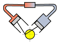 1 (roz) – peretele fierbinte al cilindrului, 2 (cenușiu închis) - peretele rece al cilindrului (cu 3 (galben) racorduri de răcire), 4 (verde închis) – izolație termică ce separă capetele celor doi cilindri, 5 (verde deschis) – piston de refulare, 6 (albastru închis) – piston de presiune, 7 (albastru deschis) - volanți,