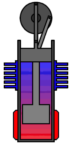 - Timpul 3: Pistonul de refulare efectuează cea mai mare parte din cursa sa: gazul este răcit. Pistonul de lucru are o cursă scurtă.