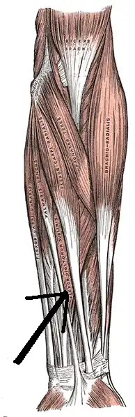 Între aceste capete de origine se întinde o arcadă tendinoasă, pe sub care trec nervul median și artera ulnară.