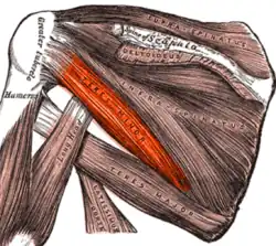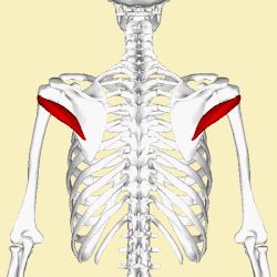 Este un rotator lateral (în afară) al brațului, ca și infraspinosul.