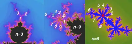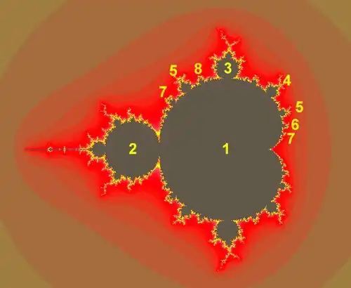 Acest bulb se numește bulbul al mulțimii lui Mandelbrot. Este format din acei parametri care au un ciclu de atracție de perioadă și număr de rotație combinatoric . Mai exact, toate componentele Fatou de perioadă conținând ciclul de atracție se ating într-un punct comun (denumit uzual punctul fix ). Dacă etichetăm aceste componente în sens trigonometric, atunci mapează componenta la componenta .