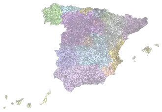 Fiecare municipiu face parte dintr-o provincie, care la rândul său este inclusă într-o comunitate autonomă (17 la număr, plus Ceuta și Melilla): unele comunități autonome au subdiviziuni adiționale de nivelul doi, cum ar fi comărcile sau mancomunidades. În total în Spania sunt 8.117 municipii, inclusiv orașele autonome Ceuta și Melilla.[1]