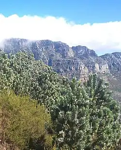 Pâlcuri reduse din pădurea indigenă persistă în zone mai umede. Cu toate acestea, o mare parte din pădurea indigenă a fost tăiată de coloniștii europeni timpurii pentru combustibil pentru cuptoarele de var necesare în timpul construcției Castelului Bunei Speranțe.[20] Nu se cunoaște întinderea exactă a pădurilor inițiale, deși cea mai mare parte s-a aflat probabil de-a lungul versanților estici ai Devil's Peak, Table Mountain și Back Table unde nume precum Rondebosch, Kirstenbosch, Klassenbosch și Witteboomen supraviețuiesc (în olandeză „bosch” înseamnă pădure și „boomen” înseamnă copaci). Hout Bay (în olandeză „hout” înseamnă lemn) a fost o altă sursă de cherestea și combustibil, după cum sugerează și numele.[20] La începutul anilor 1900 au fost plantați pini pe acești versanți de la Constantiaberg până pe Vârfului Diavolului și chiar în vârful munților, dar acestea au fost acum limitate în mare măsură, permițând înflorirea fynbosului în regiunile în care pădurile indigene afromontane nu au supraviețuit sau nu au existat vreodată.