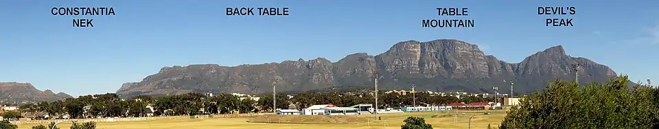 Table Mountain se află la capătul nordic al unui lanț muntos format din gresii care formează coloana vertebrală a Peninsulei Cape. Acest lanț se termină la aproximativ 50 km mai la sud, la Capul Bunei Speranțe și Punctul Capului (Cape Point). Imediat la sud de Table Mountain se află un „platou” accidentat, cu o altitudine ceva mai mică decât cea a platoului Muntelui Masă (aproximativ 1000 m), numit „Back Table”. Back Table se întinde spre sud pentru aproximativ 6 km, până la valea golfului Constantia Nek – Houtbaai. Partea atlantică a Back Table este cunoscută sub numele de „Doisprezece Apostoli”, întinzându-se de la Kloof Nek (șaua dintre Muntele Masă și Capul Leului) până la golful Hout. Partea estică a acestei porțiuni a lanțului montan al peninsulei este mai bine cunoscut prin numele zonelor de conservare de pe versanții inferiori ai acesteia: Groote Schuur Estate, Newlands Forest, Grădina Botanică Kirstenbosch, Parcul Cecilia și Constantia Nek.