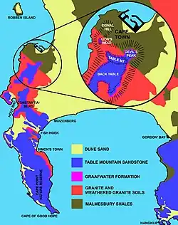 - ↑ „Geology of the Cape Peninsula”. UCT Department of Geological Sciences. Arhivat din original la . Accesat în .