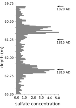 - ↑ Dai, J. (). „Ice core evidence for an explosive tropical volcanic eruption six years preceding Tambora [Dovezi din gheață pentru o erupție explozivă a unui vulcan tropical cu șase ani înainte de Tambora]”. Journal of Geophysical Research (Atmospheres). 96: 17,361–17,366.