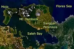 ![]() Topografia insulei Sumbawa; caldera muntelui Tambora este situată pe peninsula de nord. | |