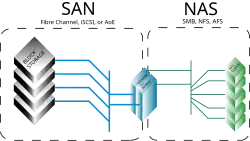 NAS oferă atât de depozitare si un sistem de fișiere. Acest lucru este adesea în contrast cu SAN (Storage Area Network), care prevede doar pe bază de bloc de stocare și frunze de sistem de fișiere privește pe "client". protocoalele SAN includ Fibre Channel, iSCSI, ATA over Ethernet (AoE) și HyperSCSI.