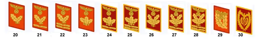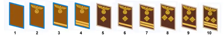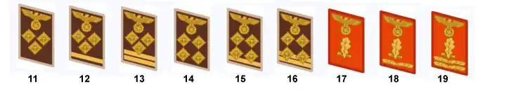Gradele în partidul nazist german și (în paranteze) rangul echivalent în armată (Wehrmacht). În ordinea numerotării petlițelor cu însemnele rangului. La nr. 25 echivalență numai în organizația SS: Oberführer. (Acest rang în SS se situa între colonel și general; echivalat cu generalul de brigadă din armata britanică). La nr. 14, 15, 16, 17, 18, 21, 23 și 24: rang în partidul NSDAP fără echivalență în alte organizații (militare ori civile) din Germania nazistă.[6]