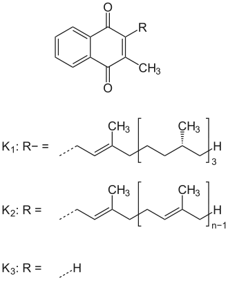 Din punct de vedere chimic, clasa vitaminelor K este alcătuită din (3-)derivați de 2-metil-1,4-naftochinonă. Vitamina K prezintă două vitamere răspândite în natură: vitamina K1 (fitomenadionă) și vitamina K2 (menachinonă).[4] Vitamina K2, la rândul ei, prezintă mai multe subtipuri, care diferă prin lungimea catenei hidrocarbonate formate din unități izoprenice. Cele mai comune subtipuri sunt menachinona-4 (MK-4) și menachinona-7 (MK-7). MK-4 se obține în corpul uman în urma conversiei vitaminei K1 la nivelul testiculelor, pancreasului și peretelui arterial.[5]