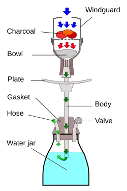 Fumul de narghilea conține mai multe substanțe chimice toxice.[3] Apa nu filtrează multe dintre aceste substanțe chimice.[3] Fumul de narghilea conține substanțe chimice toxice care provin din arderea cărbunelui, tutunului și aromelor. Fumătorii de narghilea inhalează multe substanțe chimice care pot provoca cancer, boli de inimă, boli pulmonare și alte probleme de sănătate.[4] Aceste substanțe chimice includ nitrozamine specifice tutunului, hidrocarburi aromatice policiclice (HAP, de exemplu benzo [a] piren și antracen), aldehide volatile (de exemplu formaldehidă, acetaldehidă, acroleină), benzen, oxid de azot, metale grele (arsenic, crom, plumb) și monoxid de carbon (CO). [4] Fumatul în narghilea crește cantitatea de monoxid de carbon (CO) din corpul unei persoane la opt ori mai mare decât nivelul normal.[5] În comparație cu fumatul o țigară, o singură sesiune de narghilea expune utilizatorii la mai mult monoxid de carbon și HAP, nivele similare de nicotină și niveluri mai scăzute de nitrosamine specifice tutunului[6][4]. Din cauza inhalării acestor substanțe chimice, fumătorii de narghilea prezintă un risc crescut de a prezenta multe dintre aceleași probleme de sănătate ca și fumătorii de țigări[7][3].