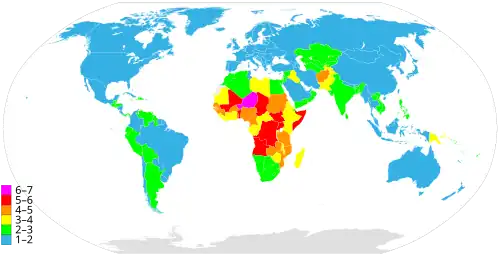 - indicele sintetic al fecundității (numărul mediu de copii născuți de o femeie în timpul vietii) variază intre valori mai mari de 7 - în câteva state din Africa Subsahariană - și 1,2 în unele state ale Europei de Est). Valoarea de 2,1 din urmă pentru acest indicator este considerată limita până la care o populație își asigură înlocuirea. Sub acest prag indică tendințe regresive, iar peste această valoare indică o creștere naturală a populației în condițiile unei mortalități reduse.