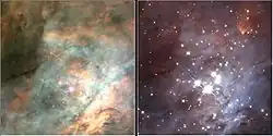 Imagine optică ce scoate la iveală nori de gaz și praf din Nebuloasa Orion; imagine în infraroșu (dreapta) ce conține stele tinere Realizat de Universitatea C. R. O'Dell-Vanderbilt, NASA și ESA.