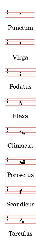 | Subpunctis | unul sau mai multe sunete anexate la sfârșitul unei neume; acest exemplu este un scandicus subbipunctis |