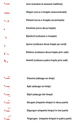 | Mora | Ca un punct în notația modernă, prelungește nota precedentă, de obicei dublând-o |