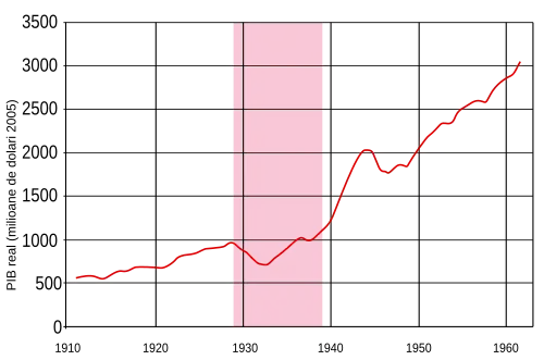 Din 1929 până în 1933 producția industrială a scăzut cu o treime,[11] ceea ce economistul Milton Friedman a numit Marea Contracție(d). Prețurile au scăzut cu 20%, provocând o deflație care a făcut mult mai dificilă rambursarea datoriilor. Șomajul în Statele Unite(d) a crescut de la 4% la 25%.[12] În plus, o treime din toți angajații au fost retrogradați la muncă cu normă parțială pe salarii mult reduse. În total, aproape 50% din forța de muncă umană din țară rămânea nefolosită.[7]