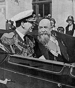 Iorga a devenit Prim-ministrul României în aprilie 1931, la cererea lui Carol al II-lea, care s-a întors din exil pentru a-și înlocui fiul, Mihai I. Relațiile sale cu monarhul autoritarist s-au îmbunătățit simțitor în timpul vizitelor pe care cel din urmă le făcea la vila din Vălenii de Munte în iulie 1930.[209] Un istoric contemporan, Hugh Seton-Watson (fiul lui R.W. Seton-Watson), a confirmat prin documente că politica agrară de confiscare pe care o ducea Carol al II-lea era în beneficiul propriu, notând: „Vanitatea imensă a profesorului Iorga l-a propulsat în mâinile regelui.”[210] Ambiția imprudentă a lui Iorga este menționată de istoricul cultural Z. Ornea, care îl enumeră, printre alții, pe Iorga, în rândul celor care se opuneau invalidării lui Carol.[130] În scurt timp, sprijinul lui Iorga pentru monarhul controversat a dus la ruperea coaliției cu PNR și PȚ. Uniunea lor agrară, Partidul Național-Țărănesc (PNȚ), s-a distanțat de politicile lui Carol, deși Iorga avea ca prioritate monarhismul „Carlist”.[130][211] Momentul a agravat disputele fondatorului PND cu Iuliu Maniu,[130] dar Iorga îl avea de partea sa chiar pe fratele lui Maniu, avocatul Cassiu Maniu, care refuza politica regionalistă a PNR-ului.[170]