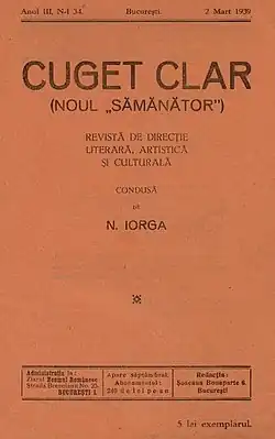 În 1936 a predat la Universitatea din Paris, și a ținut o conferință la Société des études historiques, înainte de a găzdui Comitetul Internațional al Istoricilor de la București.[247] A mai fost în Țările de Jos, unde a ținut un discurs despre istoria socială a Imperiului Bizantin: L'Homme byzantin („Omul bizantin”).[251] La întoarcere, dorind să-și reînnoiască campania împotriva moderniștilor, Iorga fondează revista neo-sămănătoristă Cuget Clar.[252]