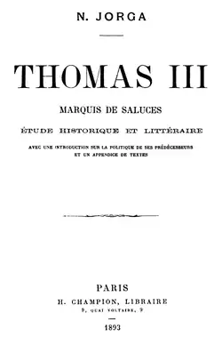 Oarecum nesatisfăcut de educația în Franța,[47] Iorga și-a prezentat disertația și, în 1893, a plecat în Imperiul German, pentru a se înscrie la programul de doctorat al Universității din Berlin. Lucrarea sa despre Thomas III Marquis de Saluces nu a fost primită pentru că Iorga nu a studiat trei ani înainte, așa cum se cerea. Ca alternativă, a spus că lucrarea este în întregime propria sa muncă, dar afirmația sa a fost invalidată tehnic, considerându-se că lucrarea sa a fost redactată de un mai bun vorbitor de limbă germană, ale cărui intervenții nu au modificat esențialul lucrării.[46] I s-a permis să-și dea doctoratul la Universitatea din Leipzig; pentru lucrarea sa, revizuită de o comisie formată din trei savanți germani (Adolf Birch-Hirschfeld, Karl Lamprecht și Charles Wachsmuth), i s-a acordat diploma în august.[48] Pe 25 iulie, Iorga a mai primit și diploma de la École pratique pentru munca anterioară depusă la Philippe de Mézières, analizată de o comisie formată din Gaston Paris, Charles Bémont și alții.[46] Și-a petrecut timpul chestionând surse istorice din arhivele din Berlin, Leipzig și Dresden.[49] Între 1890 și sfârșitul lui 1893, a publicat trei scrieri: debutul în poezie (Poezii, Poeme), primul volum al seriei Schițe din literatura română (1893; al doilea în 1894) și lucrarea din Leipzig, tipărită în Paris ca Thomas III, marquis de Saluces. Étude historique et littéraire.[50]
