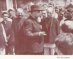 În 1910, anul în care a făcut turul Vechiului Regat în care a ținut mai multe conferințe, Nicolae Iorga s-a raliat din nou cu A. C. Cuza pentru a constitui Partidul Naționalist-Democrat. Parțial constituit pe baza componentelor antisemite ale revoltelor din 1907,[60][91][118] doctrina sa descria comunitatea evreiască din România și evreii în general ca fiind un pericol pentru dezvoltarea României.[119] La începuturile sale, partidul folosea ca simbol svastica (卐), promovată de Cuza ca simbol mondial al antisemitismului și, mai târziu, al „rasei ariene”.[120] De asemenea cunoscut ca PND, a fost primul grup românesc care a reprezentat mica burghezie, intervenind între cele două partide care s-au aflat la putere timp de trei decenii.[121]