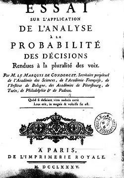 - 1785 : Essai sur l’application de l’analyse à la probabilité des décisions rendues à la pluralité des voix.