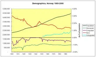 - ↑ „Tabell 0 Hele landet. Folkemengde 1. januar og endringer i året. 1951” (în norvegiană). Biroul Central de Statistică Norvegian(d). Accesat în .