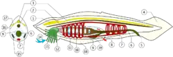 1 - veziculă ventrală (ventricul) a tubului nervos; 2 - notocord (coardă); 3 - tub neural (neurocel); 4 - înotătoare codală; 5 - anus; 6 - intestin posterior; 7 - sistem circulator; 8 - atriopor; 9 - endostil; 10 - fantă branhială; 11 - faringe; 12 - cavitate bucală; 13 - ciri; 14 - velum; 15 - gonadă (ovar, testicul); 16 - ocelii lui Hesse; 17 - nervi; 18 - metapleure; 19 - cecum hepatic