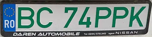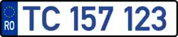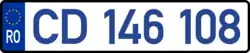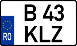 în formatul CC 12 ABC, unde CC reprezintă codul județului, 12 reprezintă o combinație de două cifre (în București poate fi o combinație de trei cifre), și ABC este un grup de trei litere din alfabetul latin. Dupa 9 mai 2007, în partea stângă a plăcii este prezent codul țării (RO). Între 1992 și 2007, banda verticală albastră utiliza drapelul României, după 9 mai 2007 se utilizează banda europeană standard (cele 12 stele ale Uniunii Europene).