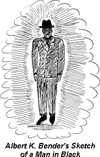 La sfârșitul verii 1953, autorul Albert K. Bender a anunțat în revista Space Review că misterul farfuriilor zburătoare a fost elucidat, urmând să publice un articol în acest sens. Cu toate acestea articolul nu a mai fost publicat, Bender susținând că a fost vizitat de trei oameni în negru care l-au convins să nu mai publice nimic, la scurt timp revista a fost închisă, la fel și organizația condusă de el, International Flying Saucers Bureau.[2]