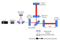 Observatorul LIGO e compus din interferometrul primar, ce constă în două fascicule aflate la 4 km, formând astfel un interferometru de tip Michelson. Un laser Nd:YAG de 1064 nm emite un fascicul cu putere de 20W, care trece printr-o oglindă se reciclare a puterii. Oglinda transmite pe deplin lumina incidentă și reflectă lumina din cealaltă parte, cauzând creșterea puterii câmpului luminos dintre oglindă și divizorul de fascicul ulterior de 700 W. De la separatorul de fascicul, lumina se deplasează de-lungul de două brațe octogonale, iar oglinzile parțial reflectorizante se creează cavități Fabry-Perot, ceea ce crește lungimea efectivă a luminii de pe braț, rezultând o putere a câmpului luminos de 100 kW.