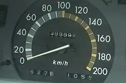 Un odometru (kilometraj) analog cu marcajul de 399.997 km parcurși